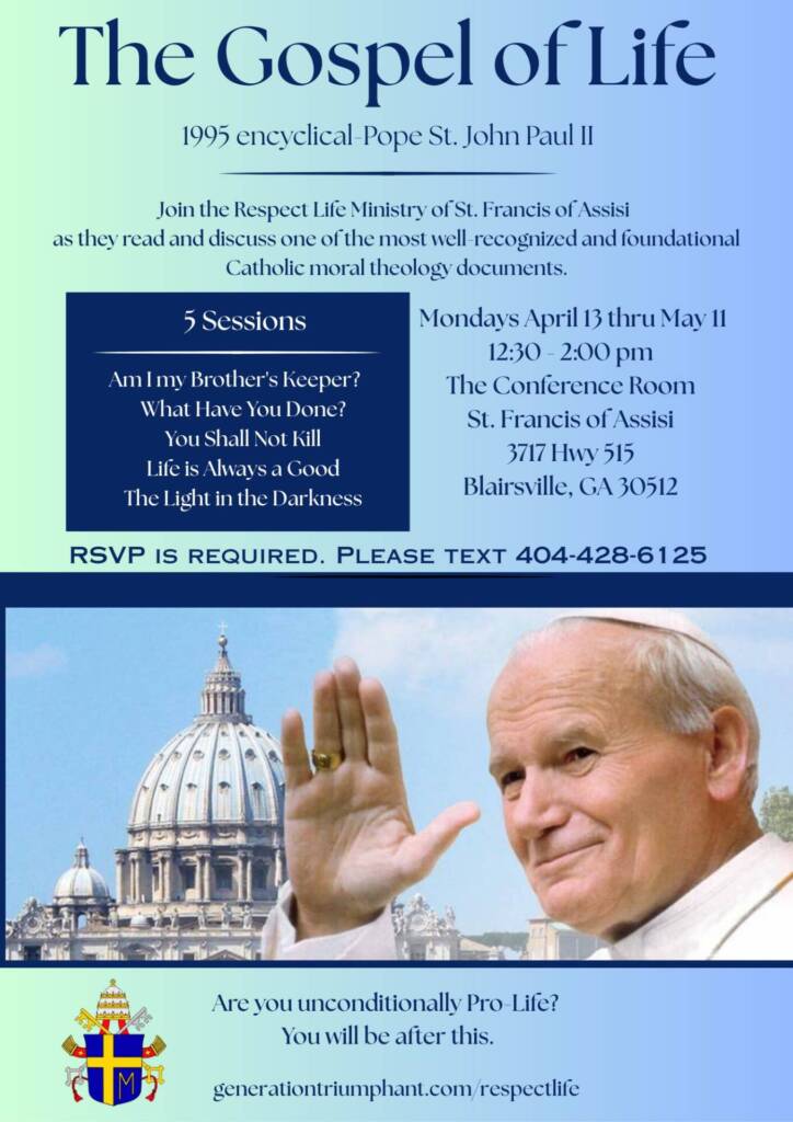 Join us as we read and discuss selections from The Gospel of Life, our ministry’s papal encyclical written by Pope St. John Paul II.